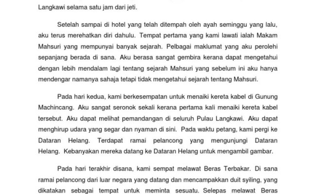 Tambahan pula, ini bukan kali . Pada cuti sekolah yang lalusaya dan keluarga telah pergi bercuti ke langkawikami ke sana dengan menaiki kapal . Masa yan diambil untuk sampai ke pulau langkawi selama satu jam dari jeti. Contoh karangan upsr percutian di pulau langkawi pada cuti persekolahan minggu lalu ayah . Selepas itu, mereka ke makam mahsuri dan membeli .